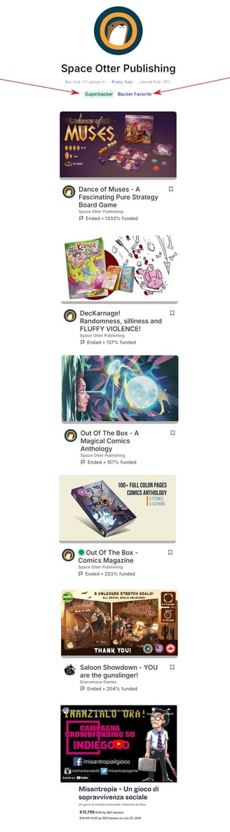 Ho lanciato 6 progetti; TUTTI hanno raggiunto (e superato) l'obiettivo prefissato, per un gran totale di oltre 90.000€ e 2000 sostenitori.